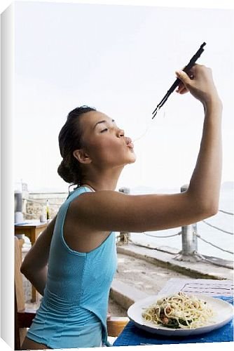 18x12 Canvas Print, White Sides. , Thai-Caucasian woman. Thai-Caucasian woman, Phuket, Thailand, Southeast Asia, Asia. Chosen by Robert Harding. Photo printed on archival quality canvas. Laminated. Canvas print stretched and hand mounted over thick 1 3/8 inch wooden bars. No frame, Gallery art appearance. Ready to hang. This item is shipped from our American lab..../ Canvas Prints of Thai-Caucasian woman from Robert Harding / chopsticks