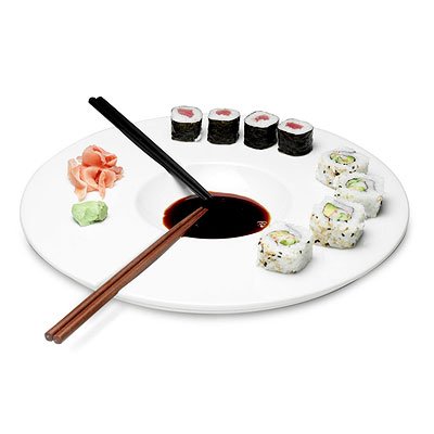 Developed by a New York City design collaborative, this ceramic platter is all set for sushi. The platter features two indentations for resting the included sets of chopsticks, a circular space for dipping and a bold white sheen, it's a fashionable and functional accent each time you bring it out. Made in China..../ Sushi Platter / chopsticks